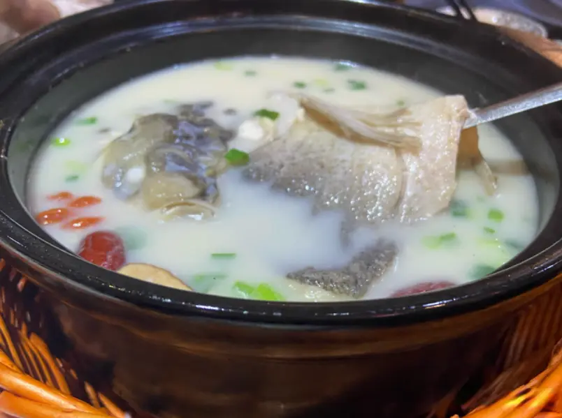 5. 煮汤底:另起锅,加入清水或高汤,加入葱段、姜片,放入鱼头。大火煮沸后,撇去浮沫,转小火继续炖煮约20分钟,直到鱼头熟透,汤底清汤浓郁。