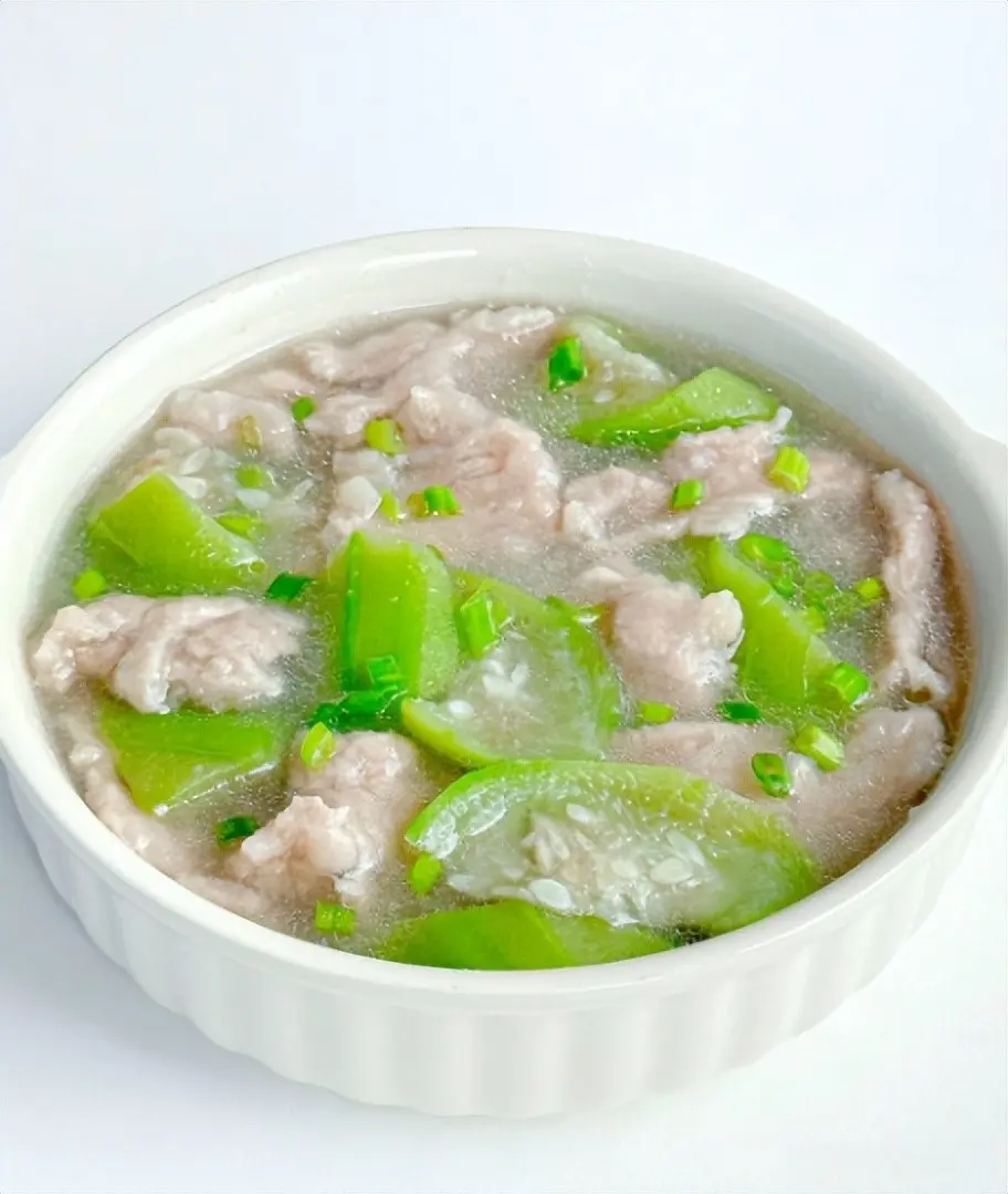 材料:丝瓜:1根(约300克);猪肉里脊或瘦肉:150克;姜片:3-4片;大葱:2根;料酒:1勺;盐:适量;白胡椒粉:适量;鸡精(可选):适量;清水:1000毫升(或高汤)