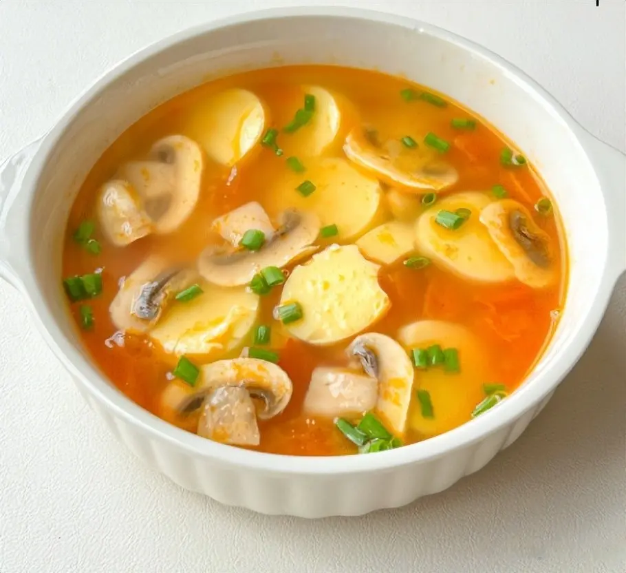 材料:番茄:2个;新鲜蘑菇(或其他菌类):150克;嫩豆腐:1块(约300克);姜:3片;大葱:2根;大蒜:2瓣;料酒:1勺;盐:适量;白胡椒粉:适量;鸡精(可选):适量;清水:1000毫升;食用油:适量